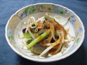 油を熱したフライパンで小松菜・なす・もやしを炒め、大根おろしダレをかけたら出来上がり。