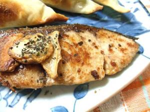 熱したフライパンにオリーブオイルをひき、にんにくを炒めて香り出しをしたら、ワラサを両面焼きます