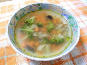 水を加えて沸騰したら、コンソメの素を加えて塩コショウで味を整えたら出来上がり。