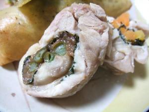 ラップに鶏もも肉を広げ、しそ・いんげんとしそ・にんじんををのせて巻き、ラップでくるみます。