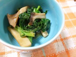 熱したフライパンに油をひいて、エリンギと湯沢菜を炒めます。