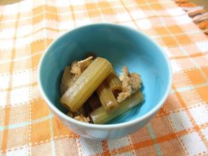 ふきと油揚げをごま油で炒め、水・醬油・酒・砂糖を加えて炒めながら煮たら出来上がり。