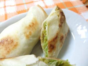 春巻きの皮の上にキャベツ・うずらの卵・お好み焼きソース・マヨネーズ・角餅をのせて巻きます。