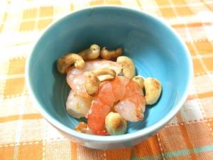 むきえびとカシューナッツをマカダミアナッツオイルで炒め、塩コショウで味を整えたら出来上がり。