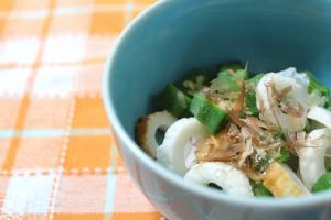 オクラとちくわを小口切りにし、かつお節と醬油をかけたら出来上がり。