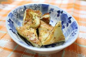 はんぺんを一口大に切り分け、バターで両面をこんがり焼きます。