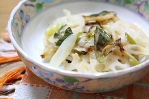 レンコンスライスを油で炒め、斜め切りした長ねぎを加えて炒めます。