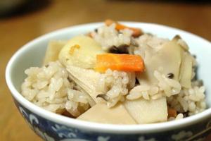 お釜に調味料を入れてから水を加え、お米を炊く分量に調整し、材料を加えて炊き込みます。