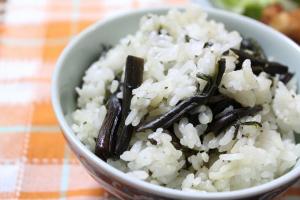 炊き上がったごはんに、わらびの煮物を混ぜ合わせたら出来上がり。