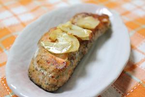 塩コショウをしたサーモンにに小麦粉をまぶし、フライパンに入れ、ニンニクと一緒に炒めたら出来上がり。