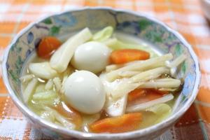 キャベツ・人参・かまぼこ・細切りたけのこ・うずらの卵を油で炒めます。