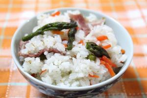 炊き上がり5分前に切ったアスパラを加え、炊き上がったら下茹でした人参を加えて全体を混ぜ合わせます。