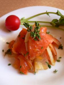 サーモンは薄切りに、大根は薄いいちょう切りに