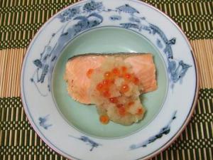 大根をおろして、ほどよく水けを切り、こぶ茶&お醤油と混ぜます。いくらも入れて つぶれないように混ぜて鮭にかけて頂きます。