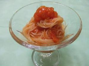 そうめんを塩少々入れて茹でて、冷水にとり、水気を切って、トマトソースと混ぜます。