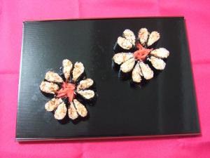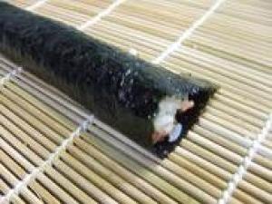 ![]() 海苔1帖を半分にして具材をのせて涙型に整形します。