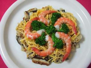 炊けるまでの間に、金糸卵・えびを茹でる・菜の花をチンする、をしておきます。