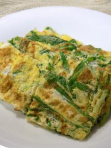 たまご3個をボウルに割り、5cm幅に切った水菜を入れる