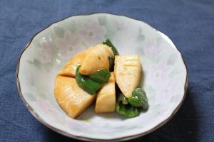 水煮たけのこは一口大に切り分け、ピーマンは乱切りにします。
