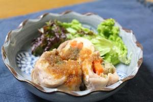 鶏もも肉の蒸し巻きを一口大に切り分け、おろしダレをかけたら出来上がり。