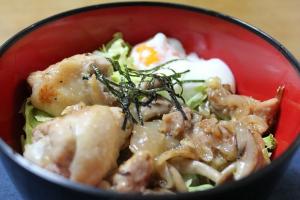 ごはんの上にレタスをしき、具と半熟卵をのせて、刻み海苔をかけたら出来上がり。
