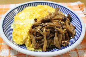 ごはんを皿に盛り、半熟に焼いた卵をのせ、きのこソースをかけたら出来上がり。