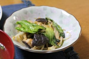 チンゲン菜・もやし・椎茸を油で炒め、オイスターソースで味付けしたら出来上がり。
