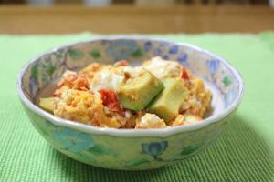 アボカド・トマトは角切りし、オリーブオイルをひいたフライパンで炒めます。