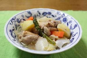 じゃがいも・にんじん・玉ねぎを一口大に、キャベツはざく切りに、アスパラガスは5cm位に切ります。