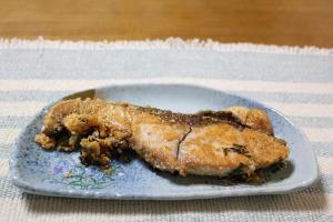 ぶりの切り身を入れ、両面を焼いたらお皿に盛り付け、レモン汁をかけたら出来上がり。