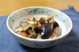 なす・さつま揚げ・しめじを油をひいたフライパンで炒めます。