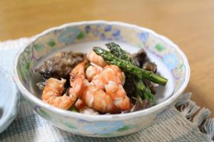 むきえび・アスパラ・舞茸を、オリーブオイルをひいたフライパンで炒めます。