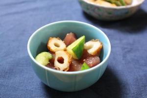 オリーブオイル・しょうゆ・わさびを混ぜ、まぐろ・きゅうり・ちくわに和えたら出来上がり。