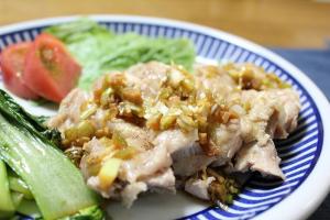 切った鶏もも肉をお皿に盛り、たれをかけたら出来上がり。