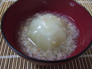かぶに火が通って柔らかくなったら、かぶだけ、お椀に入れます。