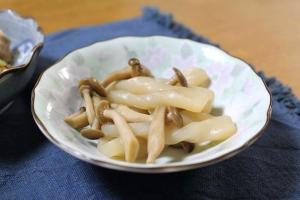 ねじりこんにゃく・しめじを、薄めためんつゆで煮たら出来上がり。