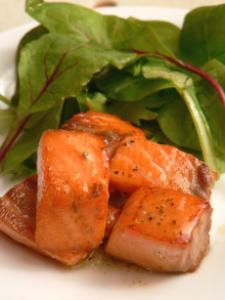 サーモンをサイコロ状にカットして塩コショウ、フライパンにオリーブオイル小さじ1、両面を焼く