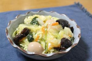 油をひいたフライパンで、キャベツ・人参・ほうれん草・きくらげ・うずらの卵を炒めます。