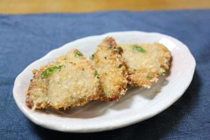 かつおは天ぷら粉・パン粉の順にまぶし、約180度の揚げ油で2~3分ほど揚げます。