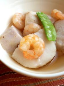 小鍋にだし汁、しょうゆ、むきえび、里芋を入れ火にかける。