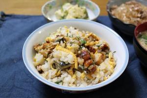 すし酢を混ぜたごはんに、うなぎ・錦糸たまご・青じそを混ぜたら出来上がり。