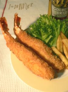 えびを真っ直ぐ伸ばし、小麦粉→卵→パン粉→卵→パン粉 と付けて、冷蔵庫で10分ほど落ち着かせる