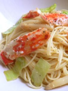 キャベツ、ホワイトアスパラ、カニ、パスタの順に追加し、 レモン汁、塩コショウで味を調えれば完成!