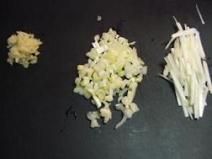![]() 1の半量を粗みじんに、半量を包丁の背でまな板にこすりつけるようにしてペースト状にします。