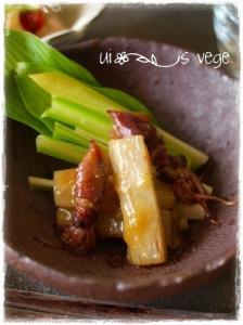 ウドの水を切り、油を引かずフライパンでコロコロ焼く。焼き目がついたら酢味噌のボウルに入れる。
