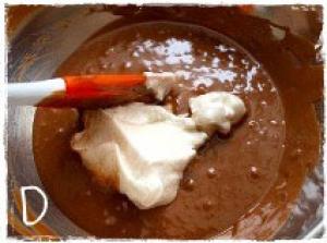 ![]() メレンゲができたら、卵黄のボウルに溶けたチョコと豆乳を入れてゴムベラでよく混ぜ米粉を加えてさらに混ぜる。(写真C)