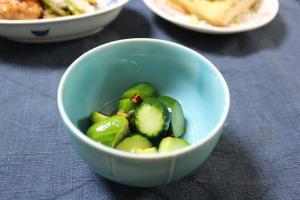 きゅうりは塩ずりし水で洗い流したら、乱切りにします。