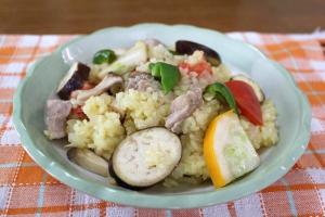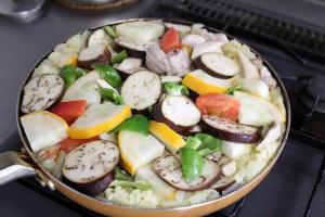 ![]() 塩コショウ・コンソメ・サフランを溶いたお湯600ccを入れて混ぜ、具材を彩りよく並べる。