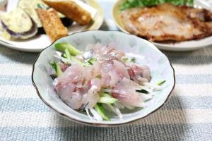 お皿に大根・きゅうり・アジを盛り付け、わさびしょうゆをかけたら出来上がり。