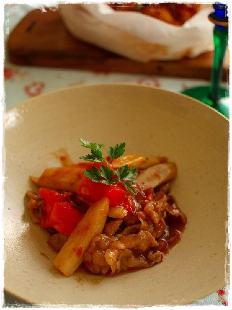 お肉の表面がカリッとしてきたらレンコン・牛蒡を加えて炒める。全体に少し火が通ったらトマト・赤ワインを加えて強火で炒める。